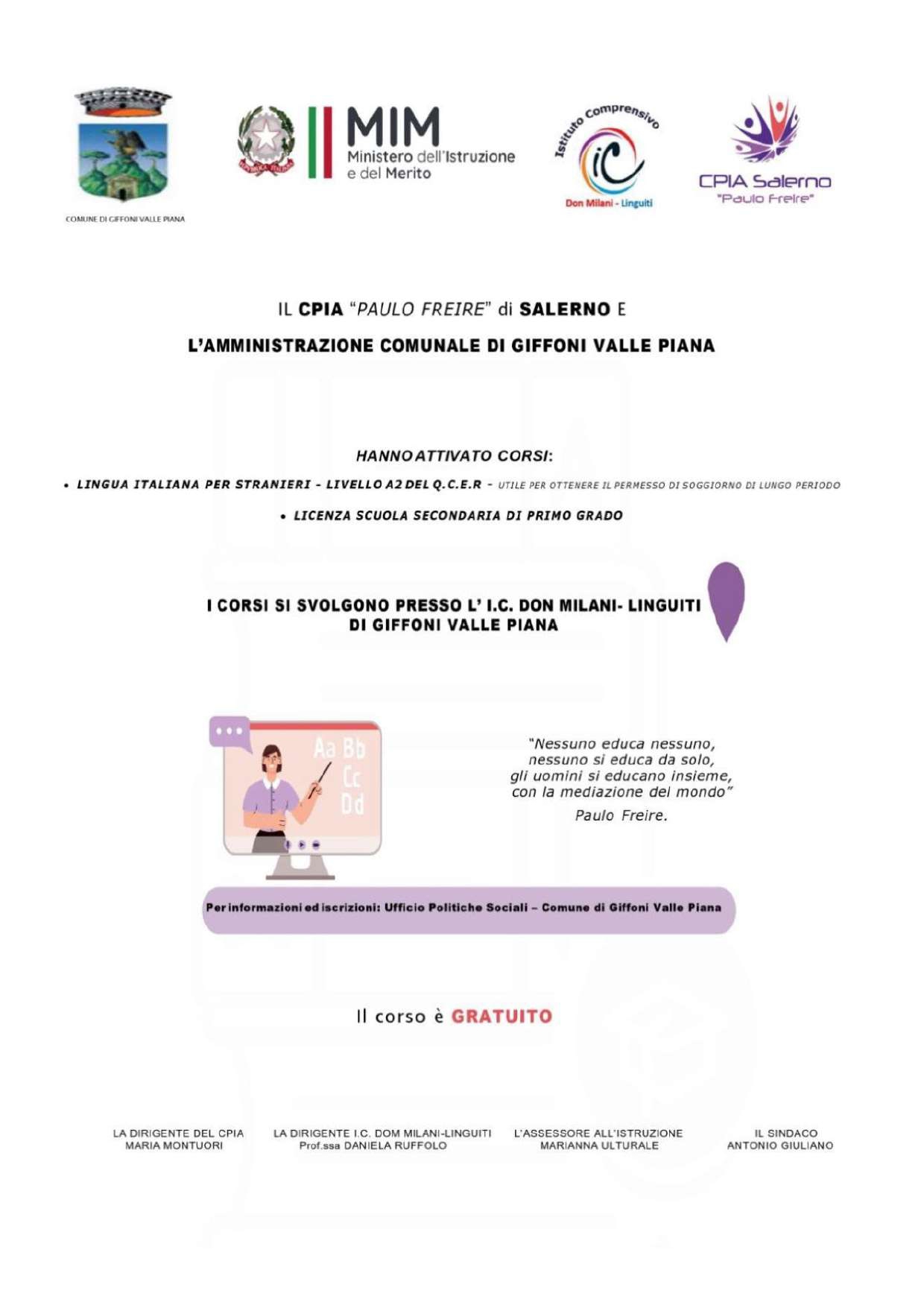 Corsi lingua italiana per stranieri – CPIA PAUOLO FREIRE di Salerno e Amministrazione Comunale di Giffoni