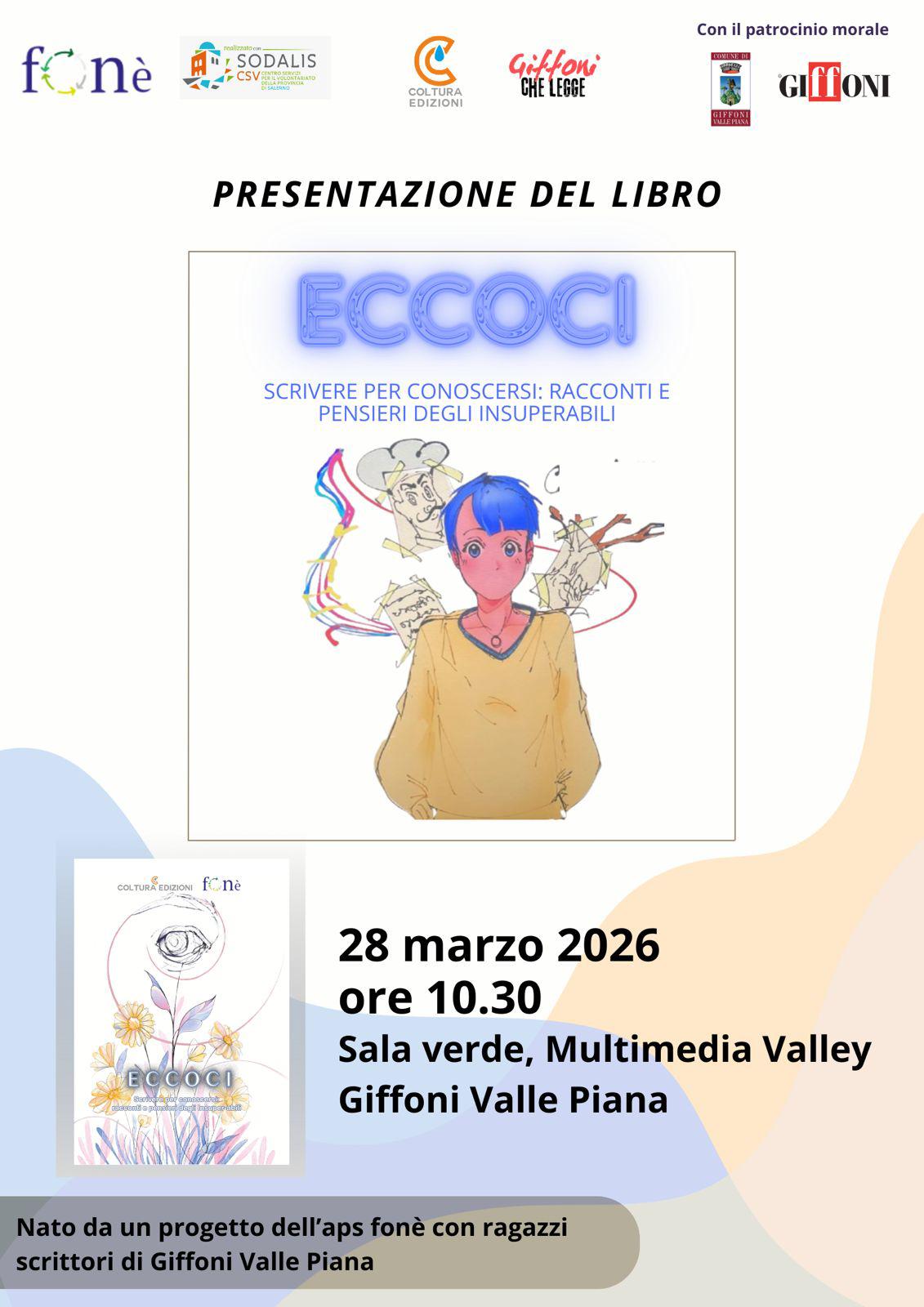Sabato 28 marzo 2026, alle ore 10.30, presso la Sala Verde di Multimedia Valley a Giffoni Valle Piana, si terrà la presentazione del libro “Eccoci. Scrivere per conoscersi: racconti e pensieri degli insuperabili”, nato da un progetto dell’APS Fonè con ragazzi scrittori di Giffoni Valle Piana ed è il frutto di un percorso di scrittura, espressione personale e condivisione. La presentazione rappresenta un’occasione importante per conoscere da vicino il libro e il valore educativo e umano dell’iniziativa. Si invitano docenti, studenti, famiglie e tutta la comunità a partecipare.